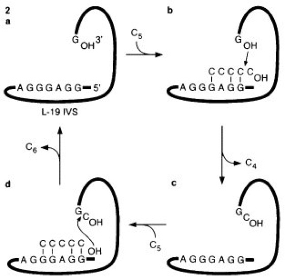 2 Das bei der unter 1 beschriebenen Selbstspleiß-Reaktion entstehende RNA-Molekül L-19 IVS (linear minus 19 intervening sequence) ist in der Lage, Oligoribonucleotide zu synthetisieren. Es geht regeneriert aus der Reaktion hervor, zeigt somit also den (Protein-)Enzymen vergleichbare katalytische Aktivität.