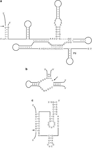 a Tetrahymena-Ribozym (Gruppe-I-Ribozym), b Hammerkopf-Ribozym, c Hepatitis-Delta-Virus-Ribozym