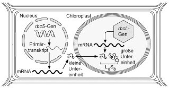 Die Synthese der Ribulose-1,5-diphosphat-Carboxylase erfolgt durch koordinierte Expression der kerncodierten rbcS- und plastidencodierten rbcL-Gene.