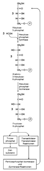 Ribulosemonophosphat-Zyklusm, Ribulosemonophosphat-Weg, Hexulosephosphat-Weg, Quayle-Zyklus, ein Assimilationsweg von Formaldehyd (H2C=O; Zwischenprodukt der Methanoxidation oder anderer C1-Verbindungen) in vielen methylotrophen Bakterien, einschließlich eines Teils der methanoxidierenden Bakterien (z.B. Methylomonas, Methylococcus). Schlüsselreaktion ist die Aldolkondensation durch die Hexulosephosphat-Synthase von Formaldehyd mit Ribulose-5-phosphat zu Arabino-3-hexulose-6-phosphat, das in einer Isomerase-Reaktion zu Fructose-6-phosphat umgewandelt wird ( vgl. Abb. ). Dieses wird einerseits durch Transaldolase- (Transaldolase) und Transketolase-Reaktionen (Transketolase) zu Ribulose-5-phosphat regeneriert und andererseits (nach der Aufnahme von 3 Molekülen Formaldehyd) zu 1 Molekül Triosephosphat umgewandelt, das zur Bildung von Zellsubstanz dient. Der Ribulosemonophosphat-Zyklus wird als möglicher Vorläufer des Calvin-Zyklus diskutiert, dem er sehr ähnlich ist.