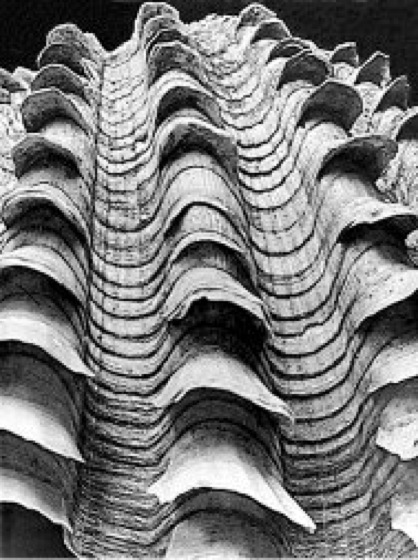 Ausschnitt aus einer Klappe von Tridacna squamosa. Die parallelen Bogenlinien entsprechen den früheren Schalenrändern, auf den strahligen Rippenwülsten erheben sie sich zu mächtigen Schuppen.