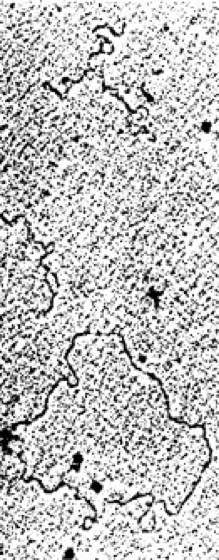 Elektronenmikroskopische Aufnahme von ringförmiger DNA in gespannter, nativer supercoil-Form (oben und Mitte links) und in entspannter Form (unten), hervorgerufen durch Hydrolyse einer einzigen Internucleotidbindung in einem der beiden DNA-Stränge (Einzelstrangbruch).