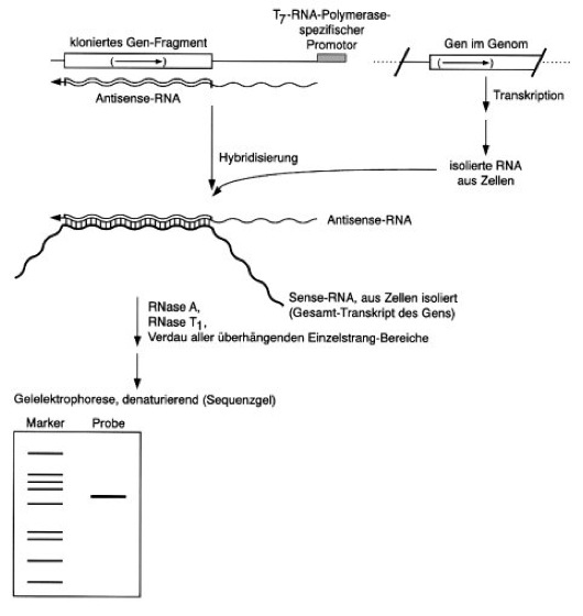 Die Abb. zeigt ein Schema zum Verfahren der RNase-Schutzexperimente. Das hier dargestellte Experiment gibt im wesentlichen nur Auskunft über die Anwesenheit eines Gens. Diese Analyse kann z.B. dann durchgeführt werden, wenn Fremdgene in einen Organismus eingebracht worden sind (Transformation) und deren Aktivität in dem neuen Organismus überprüft werden soll.