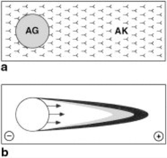 Schematische Darstellung. a Auf einer mit antikörperhaltigem Agarosegel beschichteten Glasplatte (AK) wird in einer Aussparung die antigenhaltige Analysenlösung (AG) aufgebracht. b Durch Anlegen einer Spannung wandern die Antigene unter Bildung raketenförmiger Präzipitationsspitzen in das Gel ein. Anhand der Länge dieser Präzipitationsspitzen kann die Antigenkonzentration in der Analysenlösung bestimmt werden.