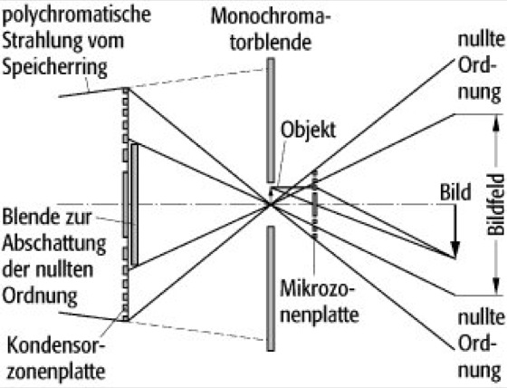 Schematischer Strahlengang in einem „gewöhnlichen“ Röntgenmikroskop am BESSY-Speicherring in Berlin.