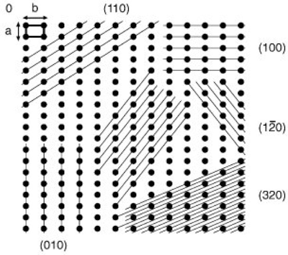 definiert alle Punkte der Ebene mit den Koordinaten x, y, z. Man bezeichnet die reziproken Maßzahlen h = 1/u, k = 1/v, l = 1/w als die Indizes der Fläche. Im Falle von Abb. 2 wäre ![]()