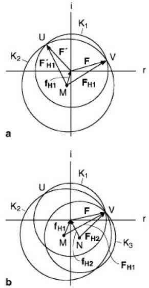 c) Der „isomorphe Ersatz“ wird speziell bei der Strukturermittlung von Proteinen angewandt. Das Verfahren ist aus den Abb. 11a und 11b zu entnehmen ( ö vgl. Abb. 11 ). Zunächst bestimmt man Strukturamplituden |F| am nativen, d.h. unbehandelten Proteinkristall. Anschließend läßt man in den Kristall Schwermetallionen oder Schwermetallverbindungen einer einzigen Schwermetallsorte H1 eindiffundieren (Diffusion). Voraussetzung dafür ist, daß die eindiffundierenden Teilchen von jedem Proteinmolekül an ein und derselben Stelle fixiert werden, d.h., die Teilchen dürfen im Kristallgitter nicht statistisch verteilt, sondern müssen streng periodisch translatorisch angeordnet vorliegen. Die Positionen des Schwermetalls innerhalb des Proteins kann durch Patterson-Synthese ermittelt und somit der Atomformfaktor fH1 in der Gaußschen Zahlenebene festgelegt werden (Abb. 11a). Man erhält so den Mittelpunkt M des Kreises K2. Der Kreisradius ist die Strukturamplitude |FH1|. Für das native, d.h. schwermetallfreie Protein wird die Strukturamplitude (Radius) |F| vom Zentrum der Gaußschen Zahlenebene aus gezeichnet (Kreis K1). Man erhält die beiden Schnittpunkte V und U und somit 2 in Frage kommende Strukturfaktormöglichkeiten, F und F':![]()
