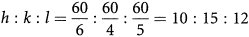 Die gemeinsame Multiplikation mit dem gemeinschaftlichen Vielfachen der Nenner (60 im obigen Fall) ändert nichts an ihrem Verhältnis, so daß auch das Indextripel h : k : l ganzzahlig bleibt: ![]()