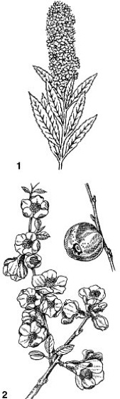 Rosengewächse, Rosaceae, nahezu weltweit, vor allem in den nördlich-gemäßigten Zonen verbreitete Familie der Rosenartigen mit 107 Gattungen ( ä vgl. Tab. ) und ca. 3100 Arten (darunter auch Sammelarten aus jungen, oft ökologisch spezialisierten Sippen). Meist Stauden, Sträucher oder Bäume mit vielgestaltigen, einfachen bis mehrfach gefiederten Blättern (oft mit Nebenblättern bzw. Nektarien) sowie gewöhnlich radiären, staminokarpellaten, 5zähligen Blüten ( ä vgl. Abb. 1 ) mit meist zahlreichen Staub- und Fruchtblättern. Der Blütenbecher kann flach bis röhrenförmig ausgebildet sein; nicht selten ist auch ein Außenkelch vorhanden. Die Früchte zeigen große Unterschiede ( Fruchtformen ), anhand derer die Rosengewächse in 5 Unterfamilien (in der Literatur zum Teil auch nur 4) eingeteilt wurden ( ä vgl. Tab. ): Die Spiraeoideae besitzen meist kleine, in großen (Dolden-)Rispen angeordnete Blüten (Blütenbecher schüsselförmig; 2–5 Karpelle mit jeweils 2 bis zahlreichen Samenanlagen) sowie vielsamige Balg- oder Kapselfrüchte. Der bis 20 m hohe, weißlich blühende Chilenische Seifenbaum (Quillaja saponaria; Chile, Peru) enthält in seiner dicken, dunklen Rinde (Quillajarinde oder Panamarinde) Saponine, die als Waschmittel verwendet werden. Als Zierpflanzen dienen: Die weiß oder rosa blühende Blasenspiere (Physocarpus; 10 Arten; Nordamerika, Nordostasien), u.a. mit der Virginia-Blasenspiere (Physocarpus opulifolius); der ebenfalls weiß oder rosa blühende Spierstrauch (Spiraea; etwa 80 Arten auf der gesamten nördlichen Hemisphäre; ä vgl. Abb. 2 ), u.a. mit dem Japanischen Spierstrauch (Spiraea japonica); die Blumenspiere, Radspiere oder Prachtspiere (Exochorda; 4 Arten; Ostasien) mit weißen Blüten und Kapselfrüchten sowie die weiß blühende Federspiere (Sorbaria; 4 Arten; Ostasien). – Bei den Rosoideae sind die Karpelle in der Regel zahlreich und die Blütenachse konvex oder konisch geformt. Die 1samigen Nüßchen oder Steinfrüchtchen bilden oft mit dem Blütenbecher oder der vorgewölbten Blütenachse eine Sammelfrucht. Die wirtschaftlich wichtigsten Gattungen sind Rubus, Erdbeere und Rose. Weitere Zierpflanzen stammen aus Gattungen wie Spierstaude, Fingerkraut, Frauenmantel, Nelkenwurz und Kerrie. Die Scheinkerrie oder Schneekerrie (Jambukistrauch, Rhodotypos; 1 Art; Ostasien) fällt auf durch große weiße Blüten und schwarz glänzende Früchte. Die Golderdbeere (Waldsteinia; 6 Arten; nördlich-gemäßigte Zone) ähnelt in ihrem Habitus der Erdbeere, blüht aber gelb. Fallugia paradoxa (einzige Art der Gattung; Südwesten Nordamerikas) ist ein kleiner, weiß blühender Wüstenstrauch, dessen kleine, ledrige Früchtchen mit langen, fedrigen Fortsätzen ausgestattet sind. Die Blüten der Schneelocke (Neviusia; 1 Art) fallen auf durch zahlreiche leuchtend weiße Staubblätter; eine Blütenhülle fehlt. – Die Neuradoideae bestehen lediglich aus der Gattung Neurada, deren Blüten 5–10 miteinander und mit dem Blütenbecher verwachsene Karpelle aufweisen. – Die Prunoideae zeichnen sich gewöhnlich durch 1 freies Karpell aus. Die Frucht ist eine 1samige Steinfrucht mit steinhartem Endokarp und einem meist saftigen Fruchtfleisch. Wichtigste Gattung ist Prunus. – Die Maloideae unterscheiden sich von allen anderen Unterfamilien durch ihre Chromosomengrundzahl 17 (anstelle von 7, 8 oder 9). Die Blüte besitzt 2–5 Karpelle, die mit der Innenwand des Blütenbechers verwachsen sind. Dieser wird zur Fruchtzeit fleischig und bildet zusammen mit den Karpellen eine Kernfrucht. Wichtigste Nutzpflanzen sind Apfelbaum, Birnbaum und Quitte. Beliebte Ziergehölze sind u.a. Felsenbirne, Feuerdorn, Zwergmispel, Weißdorn, Glanzmispel und die karminrot blühende Scheinquitte oder Zierquitte (Chaenomeles, Choenomeles; 3 Arten; Ostasien; ä vgl. Abb. 2 ), deren harte Früchte sogar eßbar sind. Als wichtigste Lieferanten von Steinobst (Kirsche, Pflaume, Pfirsisch, Aprikose usw.; Obst I ), Kernobst (Äpfel, Birnen, Quitten; Kulturpflanzen VII ) und Beerenfrüchten (Himbeeren, Brombeeren, Erdbeeren usw.; Beerenobst ) in der gemäßigten Zone sind die Rosengewächse von großer wirtschaftlicher Bedeutung. Ein Charakteristikum der Familie ist das Auftreten von cyanogenen Glykosiden. Dabei ist in den Blättern und Sprossen vor allem Prunasin, in den Samen dagegen Amygdalin zu finden. Die höchsten Amygdalin-Konzentrationen treten in Samen der Gattung Prunus auf, geringere in Samen der Unterfamilie Maloideae (wie z.B. beim Apfelbaum). ä Rosengewächse I ä Rosengewächse II .