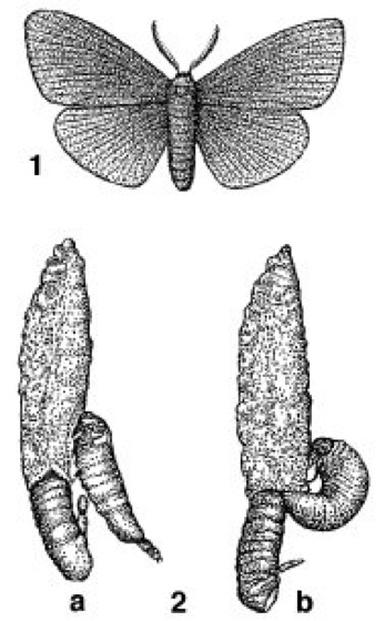 1 Einfarbiger Sackträger (Canephora unicolor), Männchen; 2Solenobia triquetrella, Puppenhaut aus dem Sack vorgeschoben; a bisexuelle, b parthenogenetische Rasse