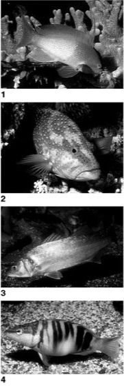 1 Harems-Fahnenbarsch (Pseudanthias squamipennis), Malediven, 2 Juwelen-Zackenbarsch (Cephalopholis miniata), Rotes Meer, 3 Wolfsbarsch (Roccus labrax), Mittelmeer, 4 Schriftbarsch (Serranus [= Serranellus] scriba), Mittelmeer