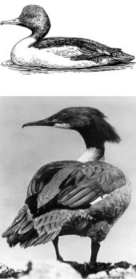 Säger, Mergus, Gattung der Enten mit schlankem, an den Kanten gesägtem Schnabel mit hakenartig gebogener Spitze; tauchende Nahrungssuche, auf Fischfang spezialisiert; Kopf meist mit Federhaube. Der in Deutschland im Bestand stark gefährdete, 66 cm große Gänsesäger (Mergus merganser; ä vgl. Abb. und ö Entenvögel I , Europa VII ) nistet in Baumhöhlen an See- und Flußufern und überwintert hauptsächlich auf Binnengewässern. Der mit 58 cm etwas kleinere, ebenfalls stark gefährdete Mittelsäger (Mergus serrator) ist durch ein braunes Brustband gekennzeichnet; er besiedelt die Küstenregion und nistet am Boden. Als Wintergast aus dem nördlichen Eurasien erscheint der 42 cm große, schwarz-weiße Zwergsäger (Mergus albellus) auf Küsten- und Binnengewässern Mitteleuropas.