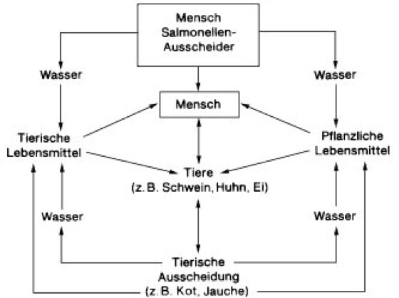 Die Übertragung erfolgt meist durch mit Fäkalien verunreinigte Nahrungsmittel. Bevorzugt sind die Erreger an Fleisch und Fleischprodukten (besonders Schweinefleisch und Geflügel), Eiern (Hühnerei) und Eiprodukten, Milcherzeugnissen (Milch) und Speiseeis zu finden. Die Zunahme der Erkrankungen in den letzten Jahren wurde durch die Intensivierung der Tierhaltung (insbesondere Geflügel und Schweine) auf engem Raum (Massentierhaltung), die Verarbeitung der Tiere in Zentralschlachthöfen mit halbautomatischem Schlachtbetrieb und die langen Anfahrtswege stark gefördert. Hoch virulente Stämme von Salmonella enteritidis können Geflügel chronisch infizieren. Über Eierstöcke und Eileiter gelangen die Keime in das Innere der Eier, so daß Lebensmittel, die z.B. mit nicht ausreichend erhitzten Hühnereiern hergestellt werden, schwere Erkrankungen auslösen können. Der (symptomlose) Befall der Tiere führt dazu, daß Geflügel oder anderes rohes Fleisch häufig beim Kauf kontaminiert ist. Eine Erkrankung kommt normalerweise nur zustande, wenn relativ große Keimmengen aufgenommen werden. Das kann leicht dann der Fall sein, wenn Salmonellen-haltige Speisen bei Zimmertemperatur aufbewahrt werden, da sich Salmonellen in bestimmten Speisen (z.B. Mayonnaise, Fleisch-, Wurstsalat) schnell vermehren. Im Wasser (vor Belichtung geschützt) sind Salmonellen in offenen Gewässern, in Abwasser, Jauche, Abortgruben, Brunnenschlamm oder gedüngtem Boden wochenlang lebensfähig. Kühlschranktemperatur, Einfrieren und Tiefkühlen überstehen sie relativ gut (Konservierung); auch gegen Hitze sind sie relativ unempfindlich. Zum Abtöten werden bei 55 °C etwa 1 h und bei 60 °C immer noch ca. 0,5 h benötigt, so daß bei kurzem Zubereiten von Speisen (Fleisch, Backwaren) in tieferen Schichten unter Umständen ein Überleben möglich ist. Bei Säuglingen und resistenzgeminderten Personen (mit schwachem Immunsystem) genügt wahrscheinlich nur eine geringe Keimzahl, um einen akuten Durchfall auszulösen. Bei diesen Personen können Salmonellen auch in die Blutbahn eindringen und eine Sepsis (Blutvergiftung) verursachen. Gefürchtet ist auch die Salmonellen-Meningitis der Säuglinge und Neugeborenen.