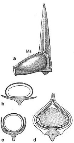 aLepidocarpon-Megasporophyll; laterale Auswüchse des Sporophylls schließen das Megasporangium bis auf einen „Mikropylen“-Schlitz (Ms) ein. b–d Intermediäre Stadien belegen die schrittweise phylogenetische Herausbildung der Lepidocarpon-„Samen“: bLepidocarpopsis lanceolatus, cLepidocarpopsis semialata, dLepidocarpon lomaxii