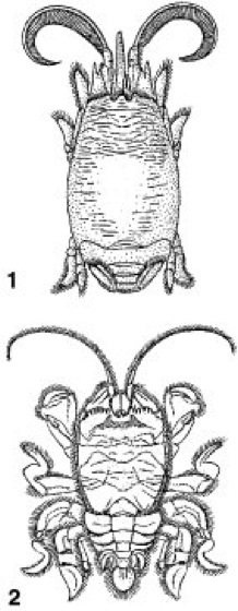 1Emerita talpoidea (3,4 cm), 2Albunea carabus (1,7 cm)