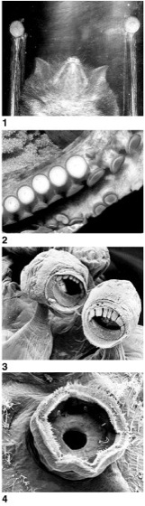 Saugnapf am Fangarm eines Kraken im Längsschnitt; 2 Saugnapf am Ende des Saugfüßchens eines Seeigels