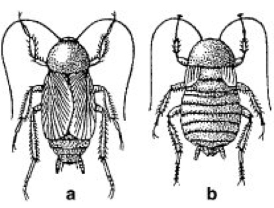 Küchenschabe (Blatta orientalis):a Männchen, b Weibchen. Die Entwicklung der Schaben verläuft über 9–13 Nymphenstadien und dauert fast ein Jahr.