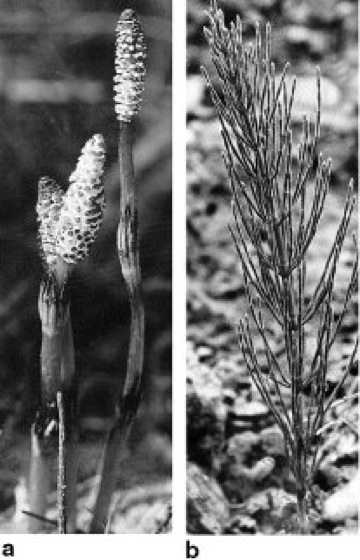 Acker-Schachtelhalm (Equisetum arvense), a mit den bleichen, unverzweigten fertilen Sprossen (März–April), b die später erscheinenden, grünen, verzweigten sterilen Triebe