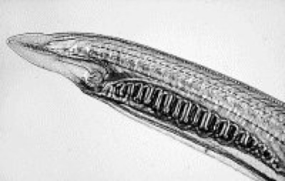 Abb. 2: Lanzettfischchen (Branchiostoma), Vorderende; deutlich sichtbar die bis in die Körperspitze reichende Chorda dorsalis, die rückenseitigen Segmente der Rumpfmuskulatur und bauchseitig die Kiemenspalten; unterseits vorn die von Cirren umstandene Mundöffnung