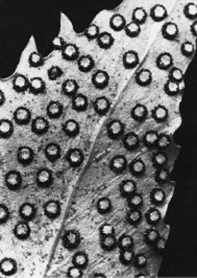 Sori (Sporangienhäufchen) auf der Unterseite eines Blatts des Schildfarns (Polystichum)