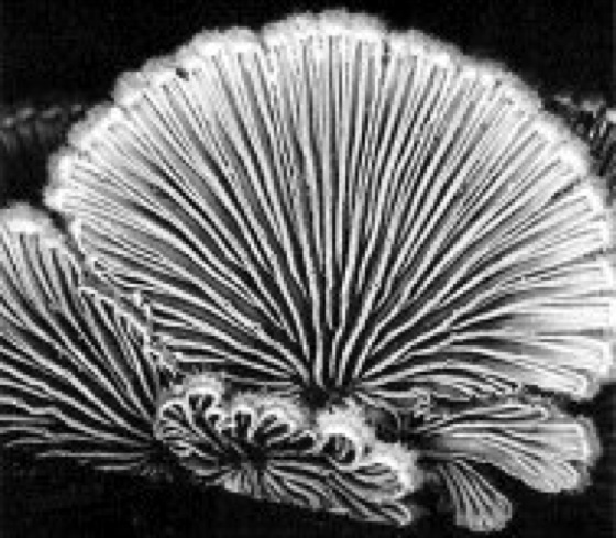 Unterseite von Schizophyllum commune Fr. (Gemeiner Spaltblättling), welche die Basidien tragenden Lamellen (helle Doppellinien) zeigt.