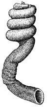 Schlangenschnecken, Tenagodus, Gattung der Siliquariidae, marine Nadelschnecken, bei denen das Gehäuse zunächst turmförmig gewunden ist, doch sind die jüngeren Umgänge röhrenförmig und berühren sich nicht ( vgl. Abb. ); leben in Schwämmen in warmen Meeren.
