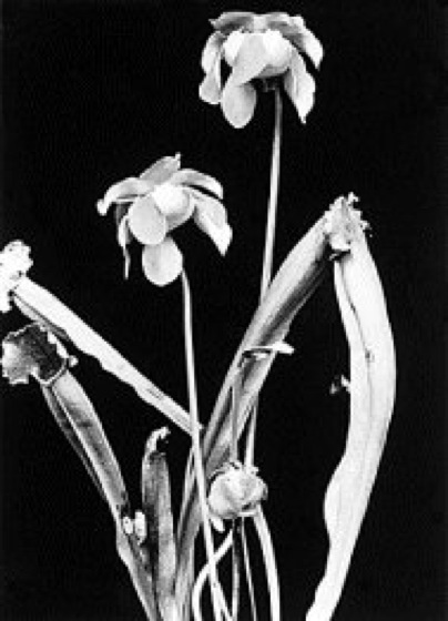 Sarracenia purpurea mit Blüten und schlauchförmigen Blättern
