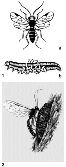 1a Kohlweißling-Schlupfwespe, b Raupe mit Kokons der schlüpfenden Schlupfwespen; 2 Schlupfwespe Pimpla instigator, sticht zur Eiablage eine Puppe der Nonne an.