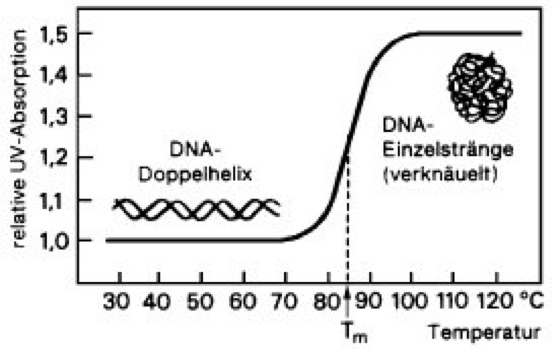 „Schmelzkurve“ von Bakterien-DNA: Der Schmelzpunkt (Tm) gibt die Temperatur an, bei der die Hälfte der helikalen DNA in den verknäuelten Einzelstrangzustand übergegangen ist. Tm ist um so höher, je höher der Gehalt an C + G (dreifache Wasserstoffbrückenbindung zwischen Cytosin und Guanin; Basenzusammensetzung [Tab.], Basenpaarung [Abb.]) in der DNA ist. Somit kann der relative Anteil an GC-Basenpaaren an isolierter und gereinigter DNA durch die Messung von Tm bestimmt werden. AT-Gehalt, GC-Gehalt.