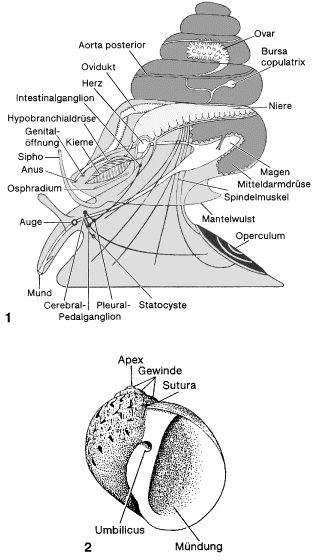 1 Innere Organisation einer Schnecke (Weibchen), Gehäuse weggelassen. 2 Das Gehäuse und seine wichtigsten Teile. Apex = Spitze (= ältester Teil); die Umgänge, mit Ausnahme des letzten, bilden das Gewinde; Sutura = Naht; Umbilicus = Nabel.