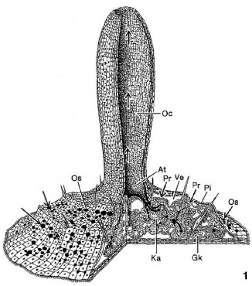 Abb. 1 Jungschwamm der Spongillidae im Blockdiagramm; Pfeile geben die Wasserströmung an (nach Kilian, 1985). At Atrium, En Endopinakocyten, Ge Geißelzelle, Gk Geißelkammer, Ka ausführender Kanal, Oc Osculum, Os Ostium, Pi Pinakoderm, Pr Prosopyle, Ve Vestibulum, Ze Zentralzelle.