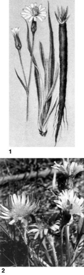 1 Garten-Schwarzwurzel (Scorzonera hispanica), links Blütenzweig, rechts Wurzel; 2 Niedrige Schwarzwurzel (Scorzonera humilis)