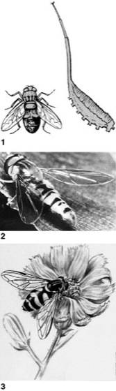 1 Schlammfliege oder Mistbiene (Eristalis tenax) und ihre Larve (Rattenschwanzlarve) mit Atemrohr; 2Syrphus spec.; 3Syrphus contuscus auf einer Blüte der Wegwarte