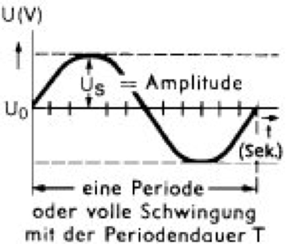 Harmonische Schwingung einer elektrischen Spannung (sinusförmige Wechselspannung): Eine elektrische Spannung U(t) = Ussin ωt schwingt um die Ruhelage U0 = 0. Die Maximalausschläge ins Positive bzw. ins Negative markieren die Amplitude Us. Nach der Schwingungsdauer oder Periode T (T = 2π/ω; ω = Kreisfrequenz) wiederholt sich die Schwingung.