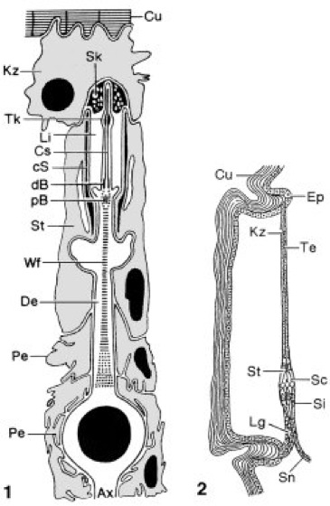 Ax Axon der Sinneszelle, Cs Ciliarstruktur, cS cuticulare Spange, Cu Cuticula, dB distaler Basalkörper, De Dendrit der Sinneszelle, Ep Epidermis, Kz Kappenzelle, Lg Ligament, Li innerer Liquorraum, pB proximaler Basalkörper, Pe Zelle des Perineuriums, Sc Scolops, Si Sinneszelle, Sk Stiftkopf, Sn Scolopalnerv, St Stiftzelle, Te Terminalstrang, Tk Tubularkörper, Wf „Wurzel“filament.