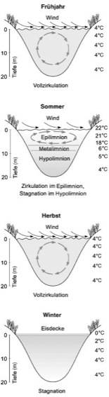 Abb. 2: Darstellung der jahresperiodischen Zirkulation und Stagnation in einem dimiktischen See der gemäßigten Breiten und mit einer windinduzierten Vollzirkulation des Wassers im Frühjahr und Herbst. Im Sommer wird das Wasser höchstens in den oberen Schichten durchmischt, im Winter bildet das Wasser mit einer Temperatur von 4 °C, das aufgrund seiner Dichte zu Boden sinkt, einen Überwinterungsraum für die Lebewesen im See.