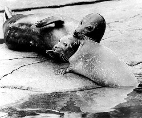Seehund (Phoca vitulina), Muttertier mit 2 Wochen altem Jungem