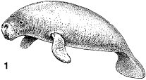 Seekühe, Meerkühe, Sirenen, Sirenia, Ordnung wasserlebender, pflanzenfressender Säugetiere von massigem Körperbau und zylindrischer Gestalt; Körperlänge 2,5–4 m; Haarkleid bis auf einige Borsten und Tasthaare am Kopf reduziert; Vorderextremitäten als fünffingrige Flossen, Hinterextremitäten fehlen (funktionell vom waagerechten Schwanzruder ersetzt). Seekühe waren einst Vorbild für die in der Mythologie beschriebenen „Meerjungfrauen“. Systematisch werden die Seekühe, gemeinsam mit den Schliefern und den Rüsseltieren, den Fast-Huftieren (Überordnung Paenungulata, Huftiere) zugeordnet; 2 Familien mit insgesamt 4 rezenten Arten. – Zu den Manatis oder Rundschwanzseekühen (Trichechidae; rundliches Schwanzruder; nur 6 Halswirbel!; adult nur 5–8 Backenzähne erhalten [Zahnwechsel]) zählen 3 Arten: Von den Küstenflüssen des östlichen Nordamerika bis zur Karibik und den Küsten des nordöstlichen Südamerika lebt der Nagel-Manati (Trichechus manatus; 2 Unterarten, hierzu der Lamantin). Vor den Küsten Floridas werden die Tiere stark von Virusinfektionen befallen, die sich in dem von Kühlwasser von Kernkraftwerken erwärmten Meerwasser leicht ausbreiten; Verletzungen durch Schiffsschrauben sind nicht selten. In Flüssen und Buchten der westafrikanischen Küste, im Tschadsee und Schari-Strom kommt der Afrikanische Manati (Trichechus senegalensis; ü vgl. Abb. 1 ) vor. Beide Arten besitzen noch Nagelreste an den Vorderextremitäten. Ausschließlich im Süßwasser (Orinoko, Amazonas, Rio Madeira) lebt nur der Fluß-Manati (Trichechus inunguis; Südamerika II). Manatis können bis zu 24 Stunden untergetaucht bleiben und kommen dann nur für wenige Sekunden zum Atemholen nach oben. Sie leben überwiegend einzeln oder in lockeren Gruppen. – Von den Dugongs oder Gabelschwanzseekühen (Familie Dugongidae; Schwanzruder seitlich spitz endend; obere Schneidezähne der männlichen Tiere teilweise stoßzahnartig sichtbar, Backenzähne nur juvenil vorhanden; Verhornungen an Gaumen, Unterkiefer und Zungenspitze) gibt es heute nur noch 1 Art (Dugong dugong; ü vgl. Abb. 2 ), vom Roten Meer und Indik bis zur Nord- und Nordostküste Australiens. Dugongs halten sich dicht unter der Wasseroberfläche auf und tauchen alle 1–2 Minuten für wenige Sekunden zum Atemholen auf. Sie leben einzeln oder in großen Ansammlungen und bevorzugen ruhige Küstengewässer. Durch Analyse von Kotproben hat man neuerdings festgestellt, daß Dugongs zusätzlich zu ihrer Seegras-Nahrung auch tierische Kost in Form von Seescheiden aufnehmen; möglicherweise decken sie dadurch ihren Eiweißbedarf. Diese Art erleidet hohe Verluste durch die kommerzielle Netzfischerei sowie durch Meeresverschmutzungen. Alle Arten der Seekühe sind nach Auskunft der IUCN vom Aussterben bedroht. (Der Bestand in den Tropen wird auf derzeit nur noch 1000 bis 2000 Exemplare geschätzt.) Historisch überliefert ist die Ausrottung (1768) der Stellerschen Seekuh(Hydrodamalis gigas). ä Säugetiere .