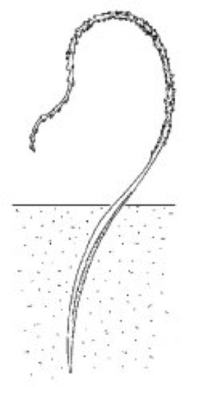 Seepeitsche, Funiculina (= Funicula) quadrangularis, Art der Seefedern, die ab 40 m Tiefe auf Schlammböden des Atlantiks, Mittelmeers und Indopazifiks lebt. Die Polypenkolonie besteht aus einem bis 1,50 m langen, schlanken (1 cm Durchmesser) Primärpolypen, an dem zweizeilig die ca. 3 mm großen Polypen ansetzen. Da der untere Teil der Kolonie durch die Einlagerung eines Skelettstabs starr, der lange polypentragende Teil sehr biegsam ist, entsteht der Eindruck einer Peitsche ( vgl. Abb. ). Die Färbung ist weißlich oder rosa.