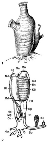 1Halocynthia papillosa (Rote Seescheide), ein Vertreter der Monascidien. 2 Bauplan einer Seescheide (Clavelina spec., Gruppe Aplousobranchiata). Ed Enddarm, Eg Egestionsöffnung, En Endostyl, Ep Epikardblase, Ga Ganglion, Hd Hoden, He Herz, Hw Haftwurzeln, Kd Kiemendarm, Kl Kloake, Kn Knospe, Kö Kiemenöffnungen, Mg Magen, Mö Mundöffnung, Nd Neuraldrüse, Ov Ovar, Pb Peribranchialraum, Sp Stolo prolifer