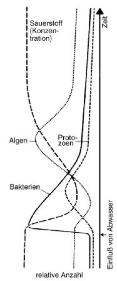 Verteilung von Bakterien, Algen, Protozoen und Sauerstoff nach Einleitung von Abwasser in einen Fluß