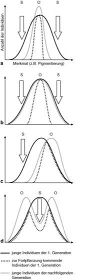 areduzierende Selektion: schränkt die phänotypische und genetische Verschiedenheit ein. bstabilisierende Selektion: erhält zusammen mit Mutationen und Rekombination den Ist-Zustand der phänotypischen und genetischen Verschiedenheit. ctransformierende Selektion: verschiebt die Häufigkeit der Phänotypen und Genotypen in Richtung auf ein Optimum. ddisruptive Selektion: spaltet die phänotypische und genetische Verschiedenheit in Richtung mehrerer Optima auf. Durch Rekombination und Mutationen ist die Variationsbreite bei jungen Individuen der nachfolgenden Generation jeweils größer als die der Elterntiere der vorhergehenden Generation.