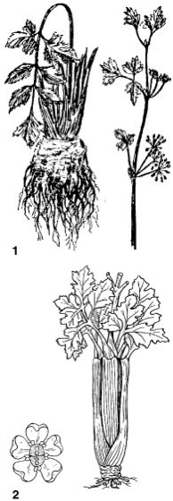 1 Echter Sellerie (Apium graveolens), links Knolle, rechts Fruchtzweig; bis meterhoch; 2 Bleich-Sellerie (Apium graveolens var. dulce) mit Einzelblüte