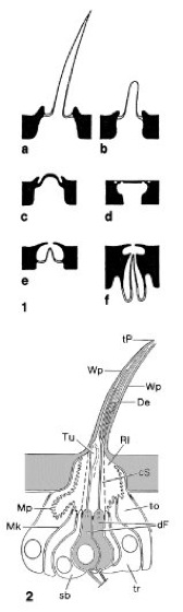 cS cuticuläre Scheide, De Dendritenaußensegmente im Haar, dF dendritischer Fortsatz der Sinneszelle, Mk Membrankontakte, Mp Membranpartikel im Bereich der tormogenen Zelle, Rl Rezeptorlymphraum, sb scheidenbildende Zelle, to tormogene Zelle, tP terminaler Porus, tr trichogene Zelle, Tu Tubularkörper, Wp Wandporen