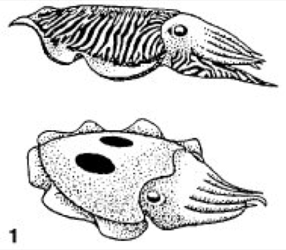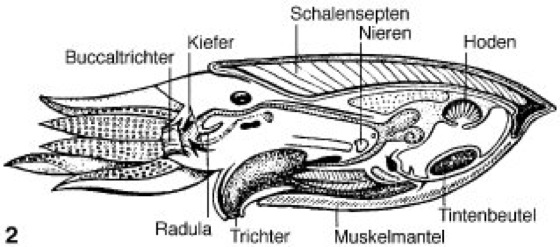 Sepiew [von *sepi- ], Gemeine Tintenschnecke, Gemeiner Tintenfisch, Sepia officinalis, Kopffüßer aus der Familie Sepiidae (Ordnung Sepioidea;Tintenschnecken) mit gedrungenem Körper und seitlichen Flossensäumen, bei dem der Schalenrest als Schulp erhalten ist. Die Sepie wird 65 cm lang. Davon entfallen 30 cm auf die Fangarme (Tentakel), die in Taschen zurückgezogen werden können. Mit ihnen und den daransitzenden 4 Reihen von Saugnäpfen werden vor allem Krebstiere und Fische gefangen und an den Mund geführt, wo sie mit Hilfe der schnabelartigen Kiefer aufgebissen werden. Am Tage graben sich die Sepien mit den Flossensäumen in den Sandboden ein. Sie können sich dabei der Färbung des Grundes durch nervöse Steuerung der Ausdehnung ihrer Farbzellen anpassen (Chromatophoren, Farbwechsel; vgl. Abb. 1 ). Bei Erregung (ausgelöst durch Bedrohung, Beute, Partner) läuft ein intensives Farb- und Musterspiel über ihre Oberseite. Werden sie angegriffen (durch Meeressäuger, Vögel, Fische), stoßen sie den Inhalt ihres großen Tintenbeutels (Tintendrüse; vgl. Abb. 2 ) aus und bringen sich im Schutz der Farbwolke in Sicherheit. Die Augen (Linsenauge; Myopsida [Abb.], Netzhaut [Farbtafel]) sind hochentwickelt und leistungsfähig (ca. 105.000 Stäbchen/mm2 Retina). Starke Konzentration der Ganglien im Gehirn und nervöse Verschaltung (u.a. durch Riesenfasern; Kolossalfasern; Nervenzelle II ) ermöglichen schnelle Reaktionen. Gedächtnis und Lernfähigkeit (Lernen) sind bemerkenswert. Bei den Männchen ist der 4. rechte Arm zum Geschlechtsarm (Hectocotylus) spezialisiert. Er ist breiter als die übrigen Arme und wird (in der Erregung intensiv gemustert) bei der Werbung dem Weibchen und dem Nebenbuhler präsentiert. Bei der Kopula überträgt er die Spermatophoren in eine Begattungstasche in der Buccalmembran des Weibchens zwischen Mund und Armbasen. Das Weibchen stößt ca. 550 Eier einzeln aus dem Trichter und schiebt sie an der Begattungstasche vorbei, wo sie befruchtet werden. Zu Trauben gruppiert, werden die Eier an Pflanzen und Korallenästen angeheftet. Männchen und Weibchen leben oft längere Zeit zusammen. Die aus den Eiern schlüpfenden Jungtiere ähneln bereits den Erwachsenen. Die Sepie lebt in Ostatlantik und Mittelmeer; sie kommt, besonders in Italien, auf die Fischmärkte. – Die verwandte Sepia elegans ist kleiner und schlanker. Sie hat auf den Endkeulen der Fangarme nicht 5–6, sondern nur 2–3 stark vergrößerte Saugnäpfe. üß Kopffüßer , Weichtiere.