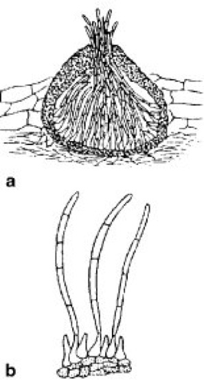 Pyknidium mit Konidien im Pflanzengewebe; b Konidienträger mit den septierten Konidien aus dem Pyknidium