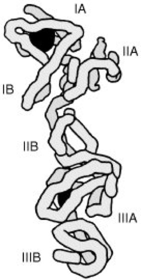 Schematische Darstellung der Molekülstruktur eines Serumalbumins (hier menschliches Serumalbumin). Die 3 Hauptdomänen werden mit I, II, III bezeichnet und jeweils in 2 Subdomänen A und B unterteilt. Die Bindungsstellen für niedermolekulare Substanzen innerhalb der Subdomänen IA und IIIA sind hervorgehoben.