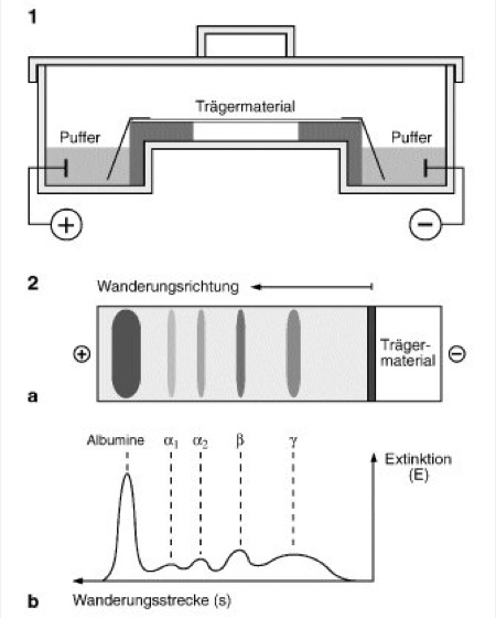 Serumelektrophoresew [von *serum- , Elektrophorese], elektrophoretische Methode in der Klinischen Chemie, die zur Trennung und Identifizierung der Serumproteine (Blutproteine) dient. Das zu untersuchende Serum (Blutserum) wird auf eine Trägerfolie aufgetragen. Durch Anlegen einer elektrischen Spannung werden die sich in der Probe befindenden Proteine aufgrund ihres unterschiedlichen Laufverhaltens in einem elektrischen Feld aufgetrennt ( vgl. Abb. 1 ). Im Anschluß an die elektrophoretische Trennung werden die Proteine angefärbt (mit Amidoschwarz oder Ponceau-Rot S [Ponceau-Farbstoffe]) und die Trägerfolie mit organischen Lösungmitteln transparent gemacht. Mit Hilfe eines Densitometers wird der Anteil der einzelnen Proteinfraktionen des Serums durch Messung der Farbintensität bestimmt. Kann die Trägerfolie nicht transparent gemacht werden, so werden die einzelnen Proteinbanden im Anschluß an die Serumelektrophorese eluiert (eluieren), und es wird der Proteingehalt dieser Fraktionen bestimmt. Mit Hilfe der Serumelektrophorese können pathologische Veränderungen in der Zusammensetzung der Serumproteine festgestellt und Erkrankungen diagnostiziert werden ( vgl. Abb. 2 ). Enzymdiagnostik, Enzymmuster (Abb.), Immunelektrophorese.