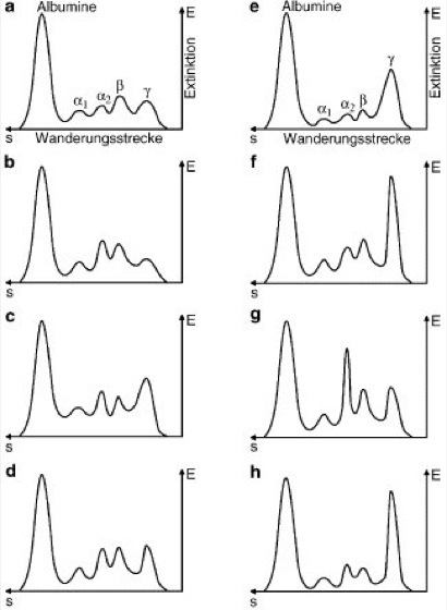 Verschiedene Elektropherogramme (siehe auch: vgl. Abb. 1 ): a normales Elektropherogramm, b akute Entzündung, c chronische Entzündung, d maligne Tumoren, e Hepatitis, f Leberzirrhose, g nephrotisches Syndrom, h monoklonale Gammopathie. Serumproteine (Tab.).