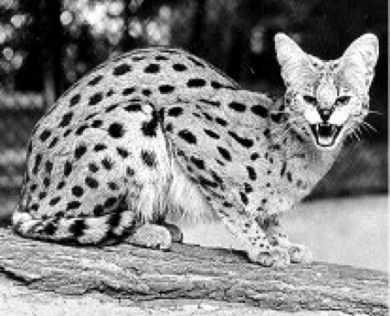 Servalm, Leptailurus serval, mittelgroße gefleckte Kleinkatze ( vgl. Abb. ) der afrikanischen Steppen, (Feucht-)Savannen und Buschgebiete; Kopfrumpflänge etwa 70 cm; langbeinig (Schulterhöhe 55 cm); Nahrung: Nagetiere, Hasen, Schliefer, Vögel. Fellfarbe (fahlgelb) und -musterung (dunkle Flecken) variieren stark. Klein gefleckt oder gesprenkelt ist die auf Westafrika beschränkte Servalkatze (Leptailurus serval liposticta), früher als eigene Art, heute als Unterart des Servals angesehen.